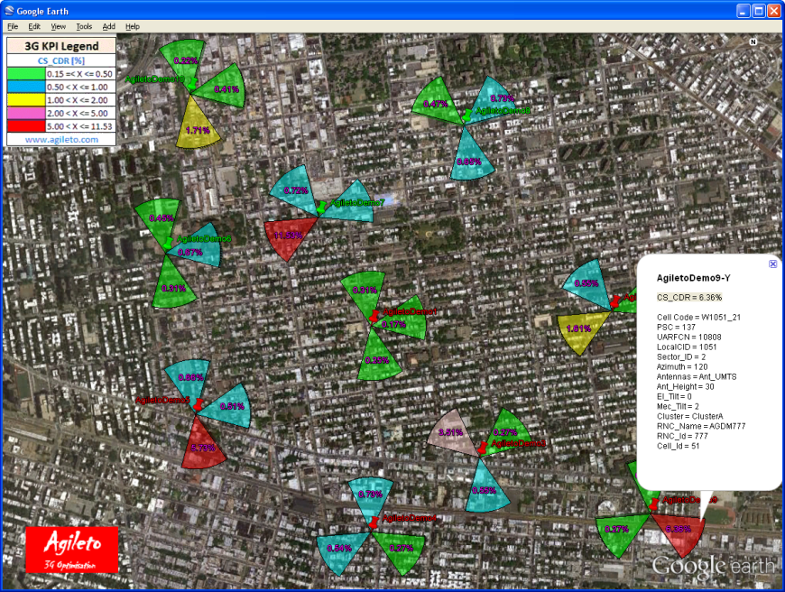 A) Below it is an example of KPI => CS_CDR [%] when the 3G Cells radius are constant but their colors are proportionally dependent on their CDR values:
