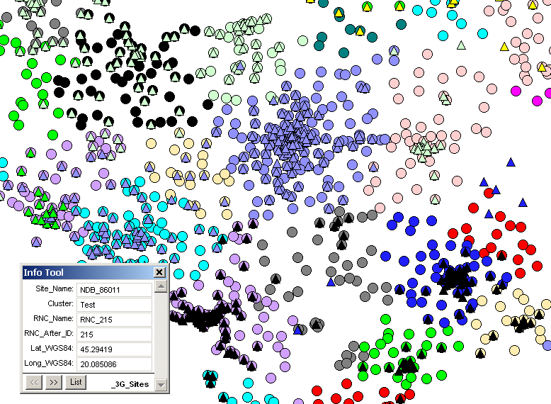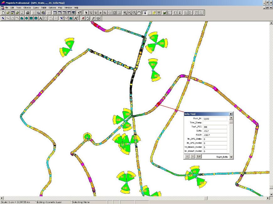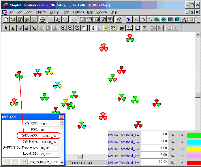 Below it is presented in MapInfo the same area presenting CS_CDR [%] when the 3G Cells have both radius and their colors proportionally dependent on their CDR values: